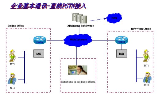此方案主要適用于采用直線PSTN接入的企業(yè)用戶(hù),有些小型企業(yè)由于公司處于建立初期或員工人數(shù)較少,所以沒(méi)有接入傳統(tǒng)的小型交換機(jī),而是直接使用直線電話線路接入。這樣的企業(yè)一般都迫切需要降低公司成本,提高客戶(hù)服務(wù)質(zhì)量,來(lái)提高公司的客戶(hù)形象。我們針對(duì)小型企業(yè)前期投資小的特點(diǎn),推薦企業(yè)前期使用IAD設(shè)備來(lái)解決企業(yè)話務(wù)問(wèn)題。小型企業(yè)分支機(jī)構(gòu)少,企業(yè)內(nèi)部通訊需求小,主要話務(wù)需求在撥打國(guó)內(nèi)國(guó)際長(zhǎng)途業(yè)務(wù)上。采用IAD設(shè)備既節(jié)省了費(fèi)用,也達(dá)到了企業(yè)發(fā)展的需求。彩虹電信還有自己開(kāi)發(fā)的軟終端,在家里或移動(dòng)辦公時(shí)可以方便使用。