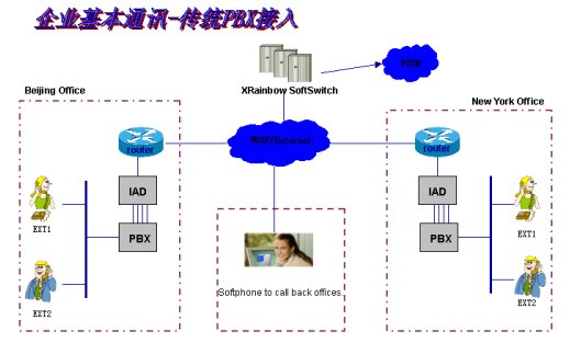 此方案主要適用于采用傳統(tǒng)交換機(jī)(PBX)的方式接入的企業(yè)用戶(hù),有些企業(yè)已經(jīng)購(gòu)買(mǎi)傳統(tǒng)交換機(jī)(PBX)實(shí)現(xiàn)了集團(tuán)電話的功能,每個(gè)員工都有自己的分機(jī)號(hào)碼,大家可以用“9+本地號(hào)碼”來(lái)?yè)艽虮镜厥性。由于這些企業(yè)人員比較多如果每個(gè)員工桌面都安裝一個(gè)網(wǎng)絡(luò)話機(jī)或IAD,成本也會(huì)大幅度上升。所以我們結(jié)合傳統(tǒng)PBX給出了這個(gè)方案,將帶有FXS口的IAD網(wǎng)關(guān)接入到PBX的前端,IAD注冊(cè)到運(yùn)營(yíng)的軟交換平臺(tái)上,然后設(shè)置員工撥“8+長(zhǎng)途號(hào)碼”撥打國(guó)內(nèi)、國(guó)際長(zhǎng)途電話,采用VOIP技術(shù)降低了1/3的通訊費(fèi)用。這樣既保留了原來(lái)的撥號(hào)方式,不改變客戶(hù)習(xí)慣,又解決了企業(yè)基本通訊問(wèn)題。彩虹電信還有自己開(kāi)發(fā)的軟終端,在家里或移動(dòng)辦公時(shí)可以方便使用。