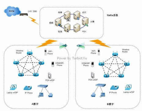 如果當(dāng)整個(gè)樓宇被WiFi網(wǎng)絡(luò)覆蓋,用戶可通過(guò)WiFi Phone或支持WiFi功能的PDA手機(jī)注冊(cè)到Netta交換系統(tǒng),如使用有線網(wǎng)絡(luò),用戶可通過(guò)Gateway