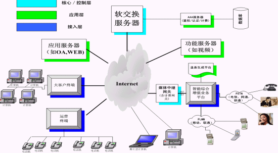 所以全能通系統(tǒng)是一種分層結構,分為接入層、核心/控制層、業(yè)務層。如下圖: