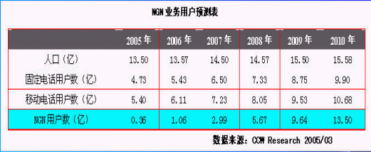 在全球洶涌的 NGN建設熱潮帶動下,2004年中國NGN建設的熱潮進一步高漲,從NGN概念的炒作、 試商用階段 ,逐步走向規(guī)模商用。 到 2004年12月,中國市場軟交換應用已經(jīng)達到400萬線,在網(wǎng)用戶達到20萬,可以說NGN市場已經(jīng)初具規(guī)模。