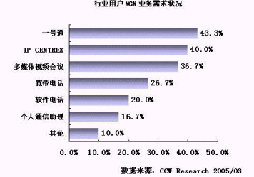 NGN 成為電信運營商滿足用戶需求的有力武器。不同的行業(yè)用戶對基于 NGN 推出的電信業(yè)務表現(xiàn)出了較大的需求差異,例如: IT通信、物流和服務業(yè)對 IP CENTREX 、多媒體視頻會議和寬帶電話等業(yè)務比較感興趣,而政府用戶對一號通等業(yè)務比較感興趣。不同行業(yè)對業(yè)務需求具有差異性,這就要求運營商基于 NGN 平臺開發(fā)的業(yè)務要有更大的靈活性,要有突出用戶通信需求的整體解決方案,要能滿足用戶的個性化需求。