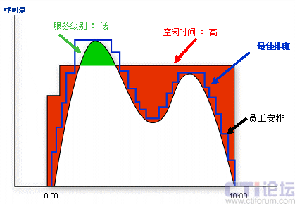 如果僅僅是工作量大,我想排班員還能夠忍受,更要命的是,排出的班表不能做到精確。要么人員太多,導致運營成本上升;要么人員不夠,無法達到預期的服務目標。以呼叫中心典型的雙峰曲線為例(如右圖),排班所追求的是人力安排和話務曲線的盡可能吻合(也就是圖中藍色的最佳排班線),達到在滿足服務水平的基礎(chǔ)上盡可能少的安排座席資源。而在手工排班中,由于大量的采用組排班,組中成員同時上下班、同時午餐,導致人力安排的靈活性降低,不能盡可能的去擬合話務曲線。此外,參考前面談到的影響人力安排的因素,手工排班中考慮了環(huán)境的影響,部分考慮了縮減,但座席技能因素考慮很少,基本認為所有人員的技能熟練度一致,不可預見性縮減也沒有考慮進去,導致最終會對服務水平造成負面影響。因此,手工排班是一種粗放型的排班方式,隨著運營要求的提高,表現(xiàn)出一定的不適應性。