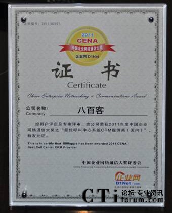 CTI論壇(ctiforum)10月31日消息(記者 張潔):10月19日,2011 秋季CENCE 中國(guó)企業(yè)網(wǎng)絡(luò)通信大會(huì)暨云計(jì)算高峰論壇在上海展覽中心盛大舉行。國(guó)內(nèi)首家SaaS廠(chǎng)商八百客憑借連續(xù)在云計(jì)算領(lǐng)域的成熟技術(shù)以及在市場(chǎng)中的廣泛認(rèn)可度,獲得“最佳呼叫中心系統(tǒng)CRM提供商”大獎(jiǎng)。