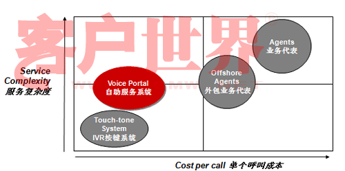 讓我們來看看這張圖。這張圖縱軸是服務(wù)的復(fù)雜度,橫軸是單位呼叫成本,傳統(tǒng)的IVR(觸鍵的語音IVR)和人工服務(wù)相比,服務(wù)的復(fù)雜度可就差多了。而Voice Portal的概念是用比較少的成本做更多的業(yè)務(wù),從成本上講比原來的傳統(tǒng)的IVR可能成本稍微高一點(diǎn)點(diǎn),但是和人工服務(wù)相比,無論是和單位自建呼叫中心座席比,還是和外包呼叫中心座席比,成本都有很大降低,但業(yè)務(wù)復(fù)雜度可以做得比傳統(tǒng)IVR復(fù)雜很多。我們承認(rèn),就提供服務(wù)的內(nèi)容來講,Voice Portal今天仍然不能夠像人工那樣提供那么全面的服務(wù),但是可以涵蓋很多服務(wù)內(nèi)容,在這方面一是因?yàn)榧夹g(shù)先進(jìn)了,另一方面也在于引導(dǎo)。今天我看到越來越多的客戶已經(jīng)開始有意識的推行自助服務(wù)形式。我前幾年去新加坡打出租,發(fā)現(xiàn)在新加坡有很多叫出租的車站,車站上有一個(gè)按鍵,按鍵上有一個(gè)編碼,說明你在什么位置,當(dāng)你打通出租車客服的電話,你只要告訴這個(gè)編碼,他們就自然而然知道你在什么地方,并把要來接你的車車牌號通過語音報(bào)讀方式通知你。今天在中國也開始有這種形式了。昨天我沒有開車,也算是支持北京市每周少開一天車的號召,我打了出租,在和出租司機(jī)聊天的過程中,出租司機(jī)說現(xiàn)在油價(jià)很貴,他們有很強(qiáng)烈的需求不愿意掃馬路,他們也有一個(gè)出租車叫車電話,那個(gè)呼叫中心大概有上百個(gè)坐席,這個(gè)公司有一萬六千輛出租車在北京,由他們來進(jìn)行搶答,搶答完之后你可以告訴說這個(gè)人在什么地方等,唯一不同的我們在自助化上還沒有做得那么到位,司機(jī)搶到了活還要給客戶打一個(gè)電話,不象新加坡完全是自助的,你只要按了那個(gè)鍵,系統(tǒng)就知道你在什么地方,當(dāng)尋找到合適的車的時(shí)候,語音報(bào)讀你車牌號就行了。我和說出租車師傅,那你打電話成本不是增加了嗎,他一笑,增加打一個(gè)電話的成本怎么也比掃馬路強(qiáng)。大家可以看看呼叫中心多有用,自助服務(wù)能省多少錢。