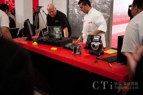 這個(gè)多層蛋糕在Avaya五月舉行的中小企業(yè)“大思維”市場活動(dòng)中登場亮相,它在一張可食用的長會(huì)議桌上逼真呈現(xiàn)了工作中的Avaya電話、視頻會(huì)議解決方案和一套IP Office控制單元。 造型巧克力、谷類食品、軟糖及其它烘焙材料同各種必要的Avaya通信組件結(jié)合在一起制作出的這個(gè)蛋糕被Buddy命名為“科技蛋糕”。 在完成由巧克力仿制電話所撥打的語音通話、并成功支持Buddy和Avaya高級副總裁兼全球通信解決方案總裁Alan Baratz博士之間的實(shí)時(shí)視頻會(huì)議之后,這個(gè)蛋糕作為甜點(diǎn)供全體活動(dòng)參加者享用。