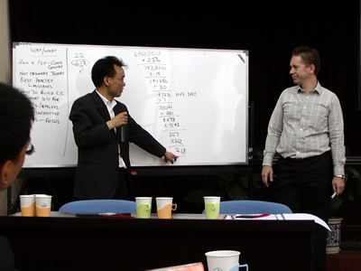公開(kāi)課在Simon Kriss先生詼諧的講課風(fēng)格的引導(dǎo)下自始至終在輕松、愉快又不失專(zhuān)業(yè)深度的氛圍中進(jìn)行著,而Simon Kriss先生以呼叫中心運(yùn)營(yíng)管理的高效率為主題,從呼叫中心的環(huán)境布局、預(yù)測(cè)管理、人力資源管理、效率管理到專(zhuān)業(yè)報(bào)告形式等知識(shí)點(diǎn)上做了專(zhuān)業(yè)深入的講解。尤其在人力資源管理和效率管理方法的傳授時(shí)引發(fā)了全體學(xué)員極大的興趣和反應(yīng),例如:就人員附著度的定義及操作問(wèn)題學(xué)員同講師展開(kāi)了多倫次的討論。而Simon