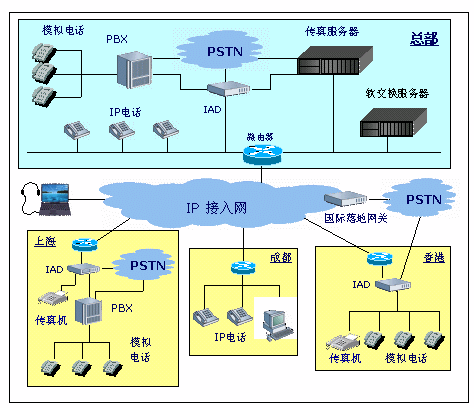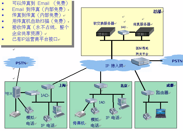 - 內(nèi)部IP電話、傳真網(wǎng)連接各地區(qū)PSTN市話網(wǎng),實(shí)現(xiàn)各地區(qū)間"長(zhǎng)途電話變市話"