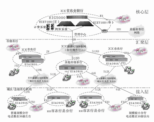省行、各地市行與縣支行、分理處與數(shù)據(jù)業(yè)務共用專網(wǎng)線路,實現(xiàn)VOIP互連,形成一個全省范圍內(nèi)的VOIP大網(wǎng),實現(xiàn)全省內(nèi)部語音的免費通信和內(nèi)部號碼的縮位拔號,節(jié)省了各行間的市話費用,節(jié)省大量長途話費。各節(jié)點按FXO:FXS