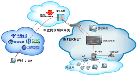 企業(yè)自行從網(wǎng)站上成功申請“企業(yè)商務通” 業(yè)務后,通過101756*全國統(tǒng)一接入號后結合中寬網(wǎng)信推薦的IPPBX,當外部對企業(yè)申請的10175*號碼發(fā)起呼叫時,該呼叫通過中國聯(lián)通的線路將話務指向中寬網(wǎng)信的媒體網(wǎng)關,由中寬軟交換平臺將呼叫送至指定的IP