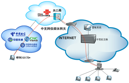 企業(yè)自行從網(wǎng)站上成功申請“企業(yè)商務通”業(yè)務后,通過101756*全國統(tǒng)一接入號結合網(wǎng)關和PBX,當外部對企業(yè)申請的10175*號碼發(fā)起呼叫時,該呼叫通過中國聯(lián)通的線路將話務指向中寬網(wǎng)信的媒體網(wǎng)關,由中寬軟交換平臺將呼叫送至指定的PBX上,由PBX接續(xù)至總臺或相應分機。另外,當您使用該業(yè)務外呼時,可以選擇在被叫電話上顯示10175*或隱藏號碼。
