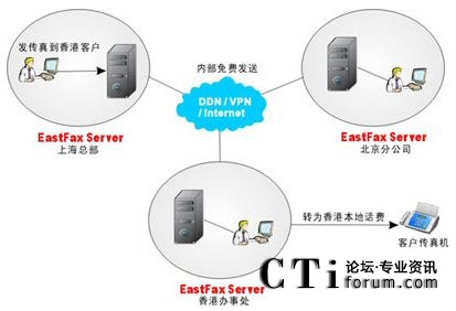 在上圖中,某集團公司總部位于上海,在北京、香港有分支機構(gòu),與分支機構(gòu)及客戶之間經(jīng)常有大量的傳真往來。目前三個地方已通過VPN實現(xiàn)了網(wǎng)絡(luò)互通,且均安裝了EastFax傳真服務(wù)器。