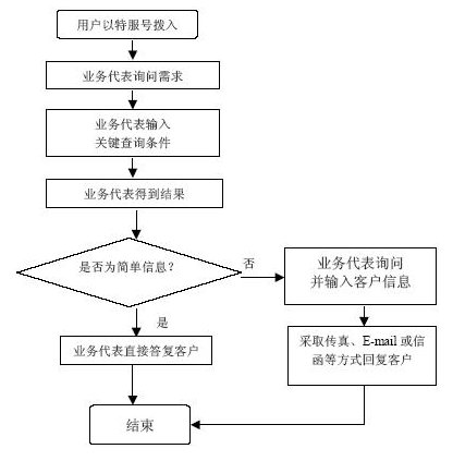系統(tǒng)自動報受理人員工號,人工交互式受理方式。受理人員根據(jù)用戶要求從服務(wù)質(zhì)量標(biāo)準(zhǔn)數(shù)據(jù)庫、電費數(shù)據(jù)庫和其他相連的數(shù)據(jù)庫查詢資料,然后通過語音方式播報資料或送到用戶指定的傳真機或其他終端設(shè)備上。主要內(nèi)容如下: