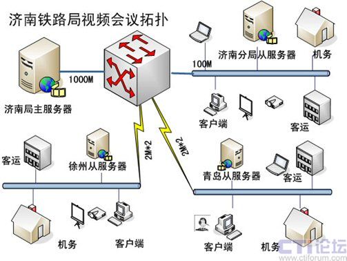 由于路局改革后組織結(jié)構(gòu)的特點(diǎn),決定了跨地域會(huì)議較多,如濟(jì)南和徐州、青島之間召開的部門級(jí)別的會(huì)議比較頻繁,加上三地之間的帶寬制約,本方案建議采用主從服務(wù)器的系統(tǒng)架構(gòu),1主3從,主服務(wù)器設(shè)置在路局網(wǎng)絡(luò)中心,原來(lái)濟(jì)南分局位置設(shè)置1臺(tái)從服務(wù)器,負(fù)責(zé)濟(jì)南地區(qū)的內(nèi)部會(huì)議,以及與其他2地的遠(yuǎn)程會(huì)議,同樣徐州、青島也各設(shè)置1臺(tái)從服務(wù)器。