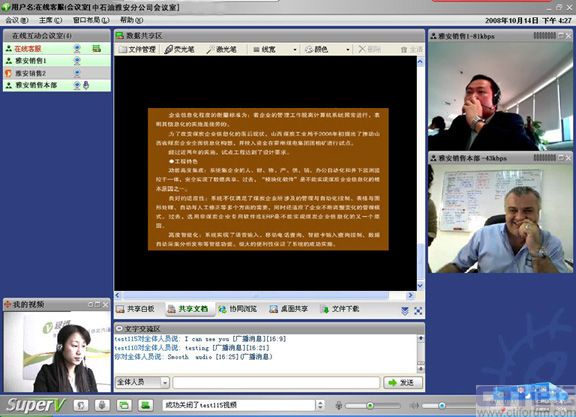 CTI論壇(ctiforum)05月19日消息: 自08年攜手視維Super-V視頻會(huì)議以來,中石油雅安分公司銷售部的日常工作會(huì)議高效及時(shí)地開展,尤其是在5.12四川大地震后,工作不但沒有中斷,而且足不出戶就可以給上級(jí)領(lǐng)導(dǎo)匯報(bào)工作,與同事交流營(yíng)銷心得。而在以前,只能通過電話或者郵件,甚至長(zhǎng)途跋涉聚集到一個(gè)地方舉行會(huì)議,既浪費(fèi)時(shí)間又增加營(yíng)銷成本。這是繼中國重汽、新加坡協(xié)美集團(tuán)等跨國集團(tuán)公司倡導(dǎo)信息時(shí)代新營(yíng)銷主義,實(shí)現(xiàn)高效運(yùn)營(yíng)的又一典型案例應(yīng)用。