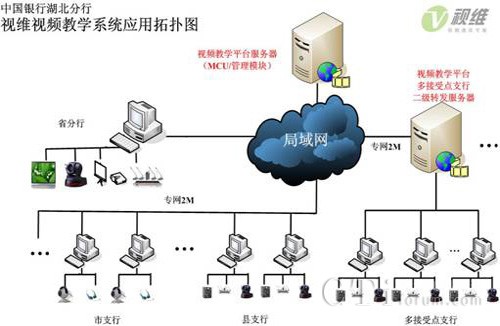 中國銀行湖北分行的視頻教學(xué)系統(tǒng)由服務(wù)器端和客戶端組成,服務(wù)器端軟件部署在省分行中心機房,配置2臺服務(wù)器,對于接受點超過5個的分支機構(gòu)配置二級轉(zhuǎn)發(fā)服務(wù)器,共支持全省各支行及支行內(nèi)多個客戶端同時在線,負責所有培訓(xùn)的召集、音視頻交互、加密等工作,各支行通過WEB方式即可實現(xiàn)客戶端軟件的自動安裝與升級,輕松實現(xiàn)實現(xiàn)省分行以及各支行共77余個接受點的高清音視頻視頻教學(xué)。同時為中國銀行湖北分行的視頻教學(xué)系統(tǒng)配置異構(gòu)兼容模塊,支持與其他視頻會議及軟、硬件視頻教學(xué)系統(tǒng)無縫融合,避免重復(fù)投資造成的浪費。網(wǎng)絡(luò)拓撲圖如下: