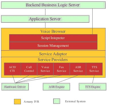 聲通技術(shù)的Amany IVR是集流程編輯環(huán)境、語法解析器和執(zhí)行平臺為一體的通用語音平臺,在這基礎(chǔ)上增加了CTI中間件和TAPI/WAV等方面的技術(shù)支持,使它不僅能作為一個獨立的語音應(yīng)答系統(tǒng)使用,而且可以作為呼叫中心理想的IVR服務(wù)器,并且可以作為外撥服務(wù)器、傳真服務(wù)器、語音門戶網(wǎng)站系統(tǒng)使用,是一個具有國際先進水平的綜合性語音平臺;所有的可選功能模塊通過獨有的Plug-in技術(shù)可實現(xiàn)功能模塊動態(tài)卸載,使客戶可以挑選自己需要的功能模塊,在將來需要的時候在配置相應(yīng)的功能模塊,使客戶成本大大降低,同可以保證將來系統(tǒng)平滑升級,使用擁有更多的選擇。