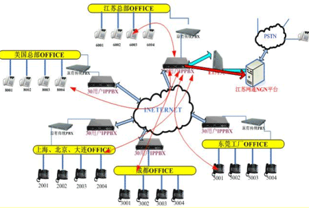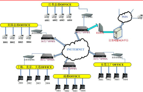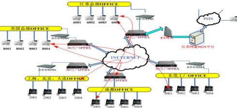 各地的IPPBX會自動識別輸入的號碼,并且通過網絡把號碼送到蘇州總部的1200交換機,江蘇的1200交換機已經通過E1與江蘇網通的NGN服務器對接。網通收到你輸入的被叫號碼,即發(fā)出呼叫,完成你的一次呼叫。如果有新辦事處成立,只要有網絡,可不用申請當地的電話線路也可實現輕松辦公。