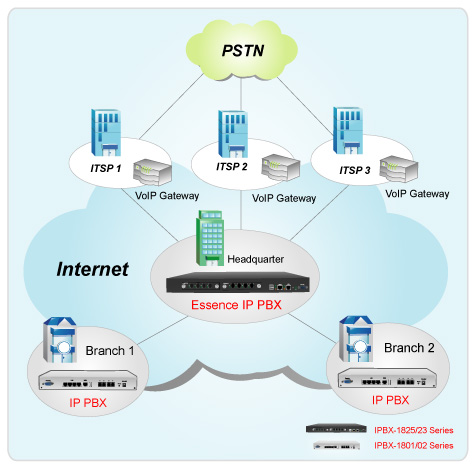 Essence IPBX系列可以注冊者之形式注冊于其他SIP協(xié)定伺服器上,如ITSP運營平臺,或是分公司之小型IP PBX注冊至總公司之大型IP PBX ,均可透過Internet 將話務無限延伸。