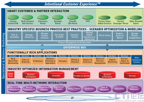 其次,CES改變了現(xiàn)有的業(yè)務應用層將功能和流程融合在一起的模式,對流程和功能進行了分離。實際上,應用功能和流程結(jié)合得越緊密,系統(tǒng)的適應性就會越差,對新業(yè)務和新產(chǎn)品的響應時間就越長,CES將業(yè)務應用層分為流程層和應用功能層,流程和功能的分離極大的提高了系統(tǒng)靈活性,降低了系統(tǒng)集成的復雜程度和成本開銷,滿足了新業(yè)務和新產(chǎn)品快速上市的要求。在流程層,運營商不僅可以選擇采用Amdocs在25年服務經(jīng)驗的基礎上總結(jié)的業(yè)界最佳實踐的業(yè)務流程,也可以選擇采用企業(yè)現(xiàn)有的業(yè)務流程;在應用功能層,Amdocs全系列軟件產(chǎn)品將更加模塊化,運營商可以選擇Amdocs全系列軟件產(chǎn)品,也可以選擇其中的個別或部分產(chǎn)品,這種高度模塊化的產(chǎn)品將以更快的速度集成到運營商已有的IT框架中。