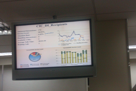 呼叫中心在三樓,在這里有先進(jìn)的軟件系統(tǒng)監(jiān)測(cè)出電話呼入、呼出量、棄線率、平均通話時(shí)長(zhǎng)等各類信息并在電視屏幕上實(shí)時(shí)顯示。據(jù)索尼(中國(guó))顧客互動(dòng)中心負(fù)責(zé)人介紹,這是采用的COPC管理體系。