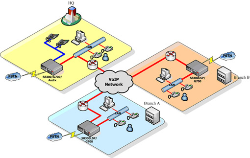 單個(gè)G700媒體網(wǎng)關(guān)提供長(zhǎng)達(dá)1小時(shí)的語(yǔ)音宣告,可以用于公司問(wèn)候語(yǔ)和其他各種語(yǔ)音提示一些辦公區(qū)域處于不同樓宇中,通過(guò)LAN的聯(lián)絡(luò),4620 IP Phone和 IP softphone發(fā)揮了最大的靈活性和良好的使用感受。