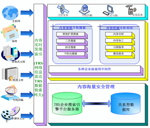 TRS公司推出的企業(yè)搜索引擎解決方案,利用TRS公司多年來自主開發(fā)的TRS Database Server作為企業(yè)搜索引擎服務(wù)的平臺?梢詫㈦娦牌髽I(yè)內(nèi)外部多種格式、多種介質(zhì)形態(tài)、多種存儲方式的內(nèi)容信息,以實(shí)時(shí)的方式將這些信息進(jìn)行索引。并且在索引的過程中力求能夠做到準(zhǔn)確,并配合以相關(guān)智能語言技術(shù)做信息的去重、自動標(biāo)引等能力。其框架如圖: