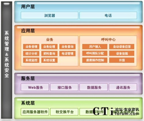 用戶層是服務(wù)熱線系統(tǒng)與系統(tǒng)使用者之間的聯(lián)系層。工作人員可以通過瀏覽器進(jìn)入系統(tǒng)的業(yè)務(wù)部分進(jìn)行工作,處理相應(yīng)事務(wù);用戶可以通過電話打入系統(tǒng)的呼叫中心部分,獲得自動或人工服務(wù);同時(shí),系統(tǒng)可以進(jìn)行電話外撥,聯(lián)系相關(guān)部門或?qū)τ脩暨M(jìn)行主動服務(wù)。