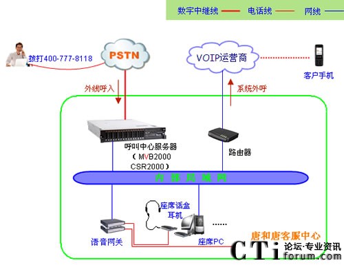 唐和唐客戶服務(wù)中心系統(tǒng)由企業(yè)局域網(wǎng)、呼叫中心服務(wù)器(含MVB2000交換平臺(tái)、CSR2000座席系統(tǒng)、數(shù)字中繼接口板)、語音網(wǎng)關(guān)及座席話盒耳機(jī)和座席電腦組成的。呼入采用當(dāng)?shù)仉娦艛?shù)字中繼線路作為呼入線路;呼出采用VOIP運(yùn)營商落地線路作為呼出線路。由呼叫中心系統(tǒng)自動(dòng)完成呼入電話與呼出電話的路由,系統(tǒng)功能包括IVR語音導(dǎo)航、來電彈屏、客戶管理、通話錄音、CDR報(bào)表、自動(dòng)外撥、點(diǎn)擊撥號(hào)等。