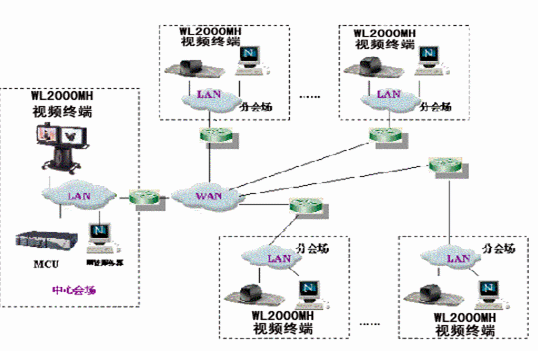 各個(gè)節(jié)點(diǎn)上的會(huì)議室型WL-2000MH終端的數(shù)據(jù)流可向多點(diǎn)控制器MCU發(fā)送動(dòng)態(tài)高清晰度圖像(720*576的FULL D1), 可以把主會(huì)場(chǎng)攝象機(jī)畫(huà)面清晰地傳輸?shù)剿蠾L-2000MH終端。
