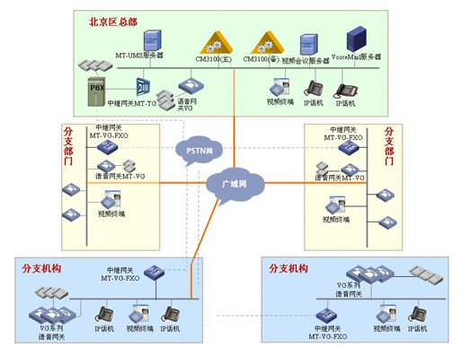 中心與各分部之間通過VOIP方式解決內(nèi)部通話問題,分部撥打北京區(qū)域的PSTN電話時從北京的中繼出局,節(jié)省了長途話費;北京的員工撥打分部的PSTN電話,從分部出局,如下圖: