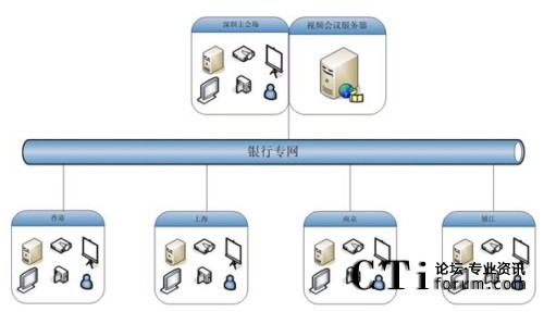 如圖,大新銀行視頻會(huì)議系統(tǒng)應(yīng)用規(guī)模為5個(gè)點(diǎn),包括香港、深圳、上海、南京、鎮(zhèn)江,服務(wù)器部署在深圳用來(lái)保證香港和內(nèi)地的鏈接效果,服務(wù)器出口帶寬為5M共享,各分會(huì)場(chǎng)通過專網(wǎng)訪問服務(wù)器。在這個(gè)網(wǎng)絡(luò)平臺(tái)上,紅杉樹網(wǎng)絡(luò)視頻會(huì)議所提供的高質(zhì)量音視頻圖像、方便易用的文檔、文件共享數(shù)據(jù)功能,使得大新銀行能夠在這個(gè)平臺(tái)上進(jìn)行從桌面討論到會(huì)議室正式會(huì)議等各種規(guī)模的應(yīng)用。在這個(gè)平臺(tái)上,除了進(jìn)行日常例會(huì)、業(yè)務(wù)交流等常見的應(yīng)用之外,業(yè)務(wù)培訓(xùn)、異地招聘等也是經(jīng)常進(jìn)行的內(nèi)容。業(yè)務(wù)人員利用數(shù)據(jù)功能,把平常培訓(xùn)很難懂的新銀行產(chǎn)品、費(fèi)率等進(jìn)行介紹,節(jié)約了以前培訓(xùn)所花費(fèi)的大量精力和時(shí)間,為新產(chǎn)品迅速占領(lǐng)市場(chǎng)掌握了主動(dòng)。