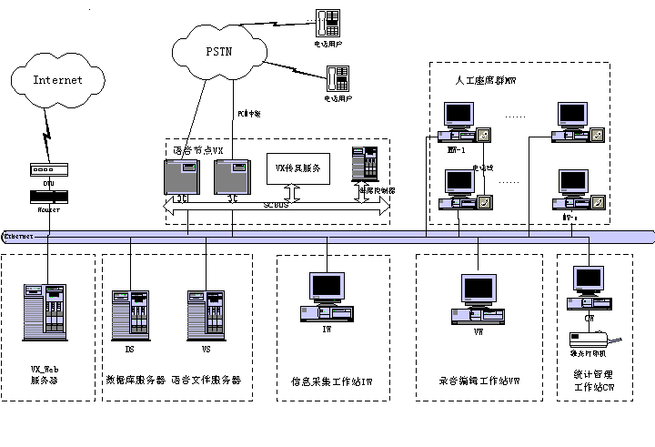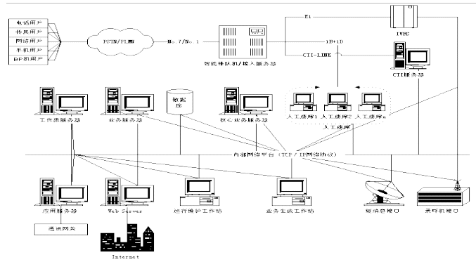客戶服務(wù)中心系統(tǒng)包含智能排隊(duì)機(jī)(含接入服務(wù)器)、核心服務(wù)器CCS、交互式語音應(yīng)答系統(tǒng)IVR、語音傳真服務(wù)器、業(yè)務(wù)服務(wù)器、工作流服務(wù)器、數(shù)據(jù)庫服務(wù)器、Internet/Intranet服務(wù)器、人工座席、尋呼機(jī)接口,手機(jī)短消息接口等組成。如下圖所示為Runsun呼叫中心系統(tǒng)結(jié)構(gòu)圖: