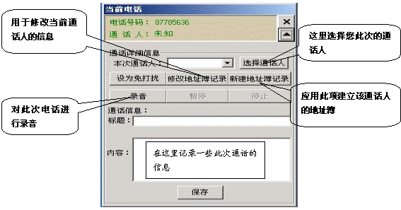 如果有電話打入時,在屏幕的右側(cè)會彈出一個對話框,它顯示了當前來電的號碼和通話人(如果在地址簿中沒有記錄則顯示為未知),點擊彈出全部菜單功能,它相當于一個功能強大的通話記事本,用它既可以邊接聽電話邊整理相關(guān)通話的文字記錄,又可以錄下通話的全部內(nèi)容。如果這個電話是您不愿接聽的,也可以將它設置為“免打擾”,這樣,這個號碼以后將存入免打擾名單中,若此號碼再呼入,系統(tǒng)將自動掛斷此呼叫。如果這個電話是您認為的重要客戶打過來的,您也可以將此號碼添加到重要客戶組中,以便您今后接聽或設置電話轉(zhuǎn)移時能與其它呼入電話相區(qū)分。