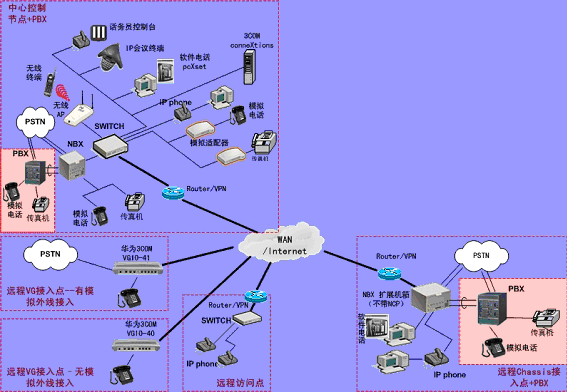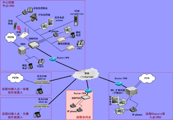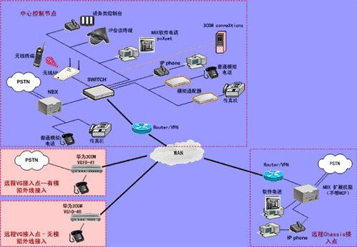 ③.遠程接入的辦公室不再需要專用的 PBX, 只需要將3Com NBX電話終端接入到WAN網(wǎng)中,就能地實現(xiàn)在WAN或Internet上與3Com