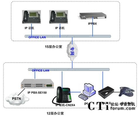 隨著企業(yè)規(guī)模的不斷擴展,公司在15層新增約50人的辦公區(qū),需要和12層實現(xiàn)內(nèi)部通訊免費(直撥分機號碼),出局路由沿用現(xiàn)有ISDN線路,F(xiàn)有的傳統(tǒng)的集團電話設(shè)備已經(jīng)滿配,無法適應(yīng)企業(yè)規(guī)模的擴張,無法跨地域組網(wǎng),不能建立多點分布式的內(nèi)部電話系統(tǒng),不能充分利用現(xiàn)有的IP網(wǎng)絡(luò)資源發(fā)展有助于提高企業(yè)競爭力的網(wǎng)絡(luò)增值業(yè)務(wù)。