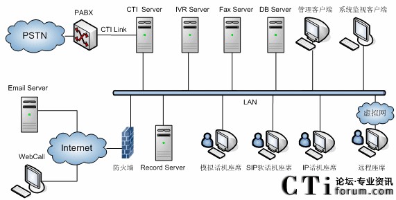 | 11 | CTI Sevrer | 電腦電話應用服務,聯(lián)絡中心通過CTI服務實現(xiàn)呼叫控制,呼叫技能路由等 |
