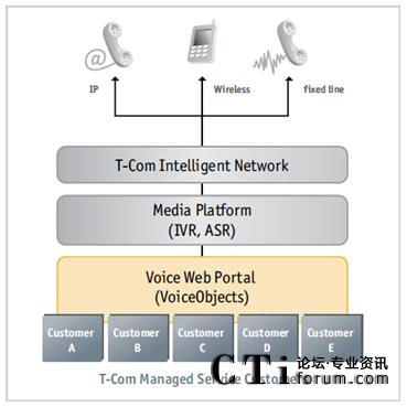 T-Com轉(zhuǎn)向VoiceObjects尋求一個可以管理成百上千應(yīng)用的解決方案,確保對客戶的高可用性和可靠性,并且?guī)椭3脂F(xiàn)有和未來的開發(fā)和更改成本在一個低水平上。在2004年初,T-Com引入了語音Web門戶,一個發(fā)揮了Web基礎(chǔ)架構(gòu)和立足于VoiceObjects服務(wù)器網(wǎng)絡(luò)版本的語音應(yīng)用服務(wù)平臺!拔覀冋趯ふ也粌H能幫助我們開發(fā),而且可以維護和管理我們的自服式電話應(yīng)用的解決方案,”Klindworth說:“當(dāng)時真的還沒有電話應(yīng)用服務(wù)器公司目錄,但這正是我們需要的:該產(chǎn)品是服務(wù)執(zhí)行平臺,并且以Web應(yīng)用服務(wù)器的方式工作。我們發(fā)現(xiàn)它就是VoiceObjects。”