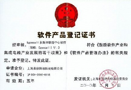 CTI論壇(ctiforum)3月8日消息(記者 袁青): 由易谷網絡自行研發(fā)的“Egoocall多媒體聯絡中心軟件”,于2010年2月10日通過上海市經濟和信息化委員會審核,獲頒“軟件產品登記證書”。(證書號:滬DGY-2010-0118)