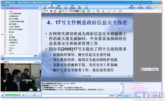 CTI論壇(ctiforum)05月07日消息: 4月8日-9日國家稅務(wù)總局組織全國省國稅地稅局IT主任與解放軍總參三院、中國信息安全評測中心、神州網(wǎng)御70多人在濟南錦繡山莊以及全國各地國稅地稅相關(guān)人員200多人使用自己辦公室的電腦通過盛維(Cenwave)新世紀提供的網(wǎng)絡(luò)視頻直播系統(tǒng)召開“國家稅務(wù)系統(tǒng)信息安全風(fēng)險評估啟動會”。此次會議是國家稅務(wù)總局首次租用網(wǎng)絡(luò)視頻會議直播系統(tǒng)召開全國性會議也是參會人數(shù)最多的一次,不僅打破地點人數(shù)的限制、克服了硬件設(shè)備的局限、節(jié)省行政成本,也是建設(shè)“兩型社會”的具體體現(xiàn)。