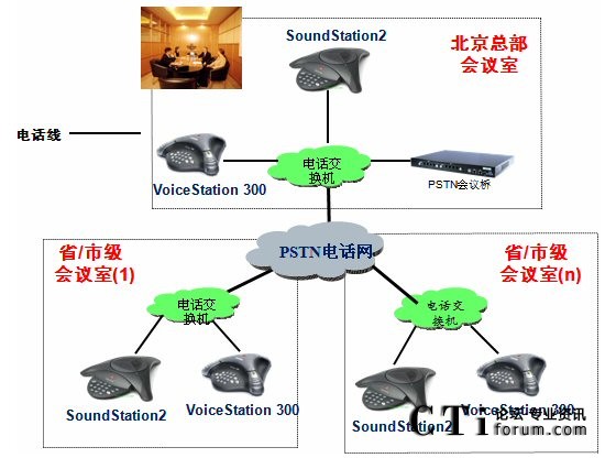 根據(jù)客戶的要求,本著“完善、經(jīng)濟(jì)、高效”的原則,我們制定了以下解決方案;系統(tǒng)利用傳統(tǒng)電話網(wǎng)絡(luò),擁有自己的會(huì)議管理系統(tǒng);北京總部方面使用Polycom SS2基本型商務(wù)會(huì)議電話;各個(gè)省/市級分會(huì)場,根據(jù)自己會(huì)場的情況自選設(shè)備;