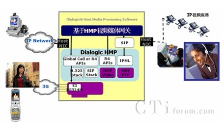基于Dialogic HMP(Host Media processing)主機(jī)媒體處理技術(shù)的視頻呼叫中心主要通過網(wǎng)絡(luò)接口卡(“瘦卡”,Digital Network Interface卡)與PSTN(3G)相連。這里的PSTN包括電信、聯(lián)通和移動等電信運(yùn)營商。也可以通過H.323、SIP協(xié)議棧直接接受來自數(shù)據(jù)網(wǎng)絡(luò)的多媒體呼叫。