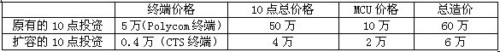 以下列出了原有使用polycom終端的1級會議系統(tǒng)和采用CTS方案擴容的2,3級會議系統(tǒng)投資比較。