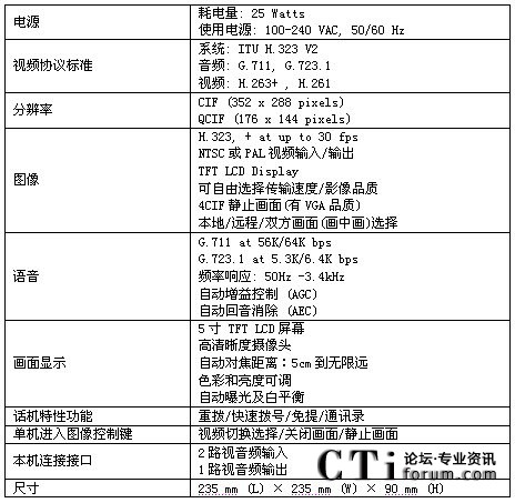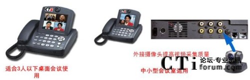 方案中采用的終端為CTS的可視電話終端,該可視電話適合于1-3人的桌面會議,自帶5寸的屏幕,不用額外連接電視機,特別適合于縣級鄉(xiāng)級等底等級的機構(gòu)使用。同時可視電話可以外接入清晰的攝像頭,滿足5-10人小會場對于視頻的清晰度要求。