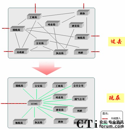 “12345” 政府熱線系統(tǒng)建設(shè)的最終目標(biāo),將要整合現(xiàn)有的全部政府部門(mén)公開(kāi)電話資源,將所有的此類(lèi)電話統(tǒng)一為一個(gè)號(hào),使政府公開(kāi)電話服務(wù)范圍覆蓋到政府公共服務(wù)的全部領(lǐng)域。通過(guò)12345電話網(wǎng)絡(luò)將各級(jí)機(jī)構(gòu)服務(wù)電話資源進(jìn)行互聯(lián)(市區(qū)縣政府、公安非應(yīng)急電話、社保局、民政局、建設(shè)局、規(guī)劃局、國(guó)稅局、地稅局、教育局、衛(wèi)生局、文體局、旅游局、交通局、房產(chǎn)局等),這樣市民就不用再被這些部門(mén)上百個(gè)不同的電話號(hào)碼弄得無(wú)所適從,也不會(huì)因?yàn)榕磺宄虑闅w哪個(gè)部門(mén)管了。