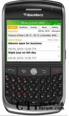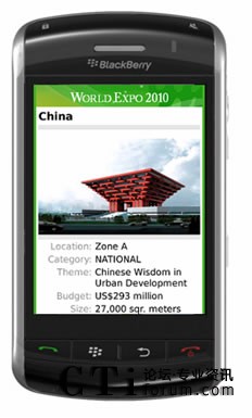 CTI論壇(ctiforum)5月6日消息(記者 楊佳林) 近日,RIM 公司與《上海日報(bào)》社共同開發(fā)的BlackBerry上海世博會(huì)應(yīng)用程序正式上線。全球4100萬BlackBerry用戶均可從App World上免費(fèi)下載并安裝該應(yīng)用程序,實(shí)時(shí)獲取最新的上海世博會(huì)新聞、場館介紹、世博園區(qū)活動(dòng)信息等,全方位了解上海世博會(huì)。