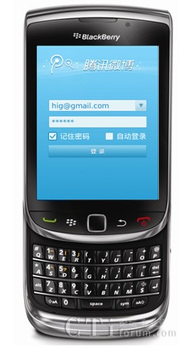圖:通過(guò)BlackBerry Torch 9800登陸騰訊微博