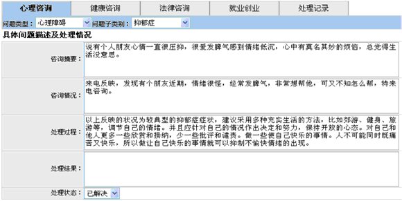 對于每次咨詢的受理以及答復記錄,是青少年咨詢平臺的重要組成部分。針對青少年的心理特點咨詢問題的類別,專門開發(fā)“12355”青少年服務臺業(yè)務受理系統(tǒng)。通過對來訪者的資料的登記,以及對咨詢服務的詳細記錄和電話錄音,今后可方便的查詢服務臺的的咨詢情況,并能有效的跟蹤處理,青少年遇到的心里、求學、婚姻和法律維權(quán)等方面的訴求。并能快速準確的統(tǒng)計服務臺的各項服務的數(shù)據(jù)。