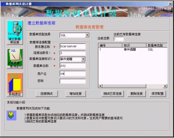 首先使用數(shù)據(jù)庫網(wǎng)關設計器定義數(shù)據(jù)庫配置,其中包括數(shù)據(jù)庫服務器的名稱和數(shù)據(jù)庫的登陸信息。該系統(tǒng)支持ODBC連接和ADO連接,支持的數(shù)據(jù)庫有ACCESS,SQL,MYSQL,ORACLE,SYBASE,配置方式如圖四所示。