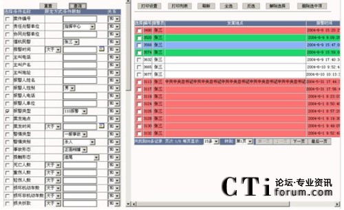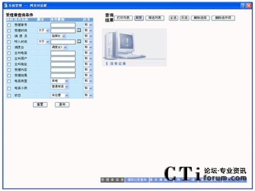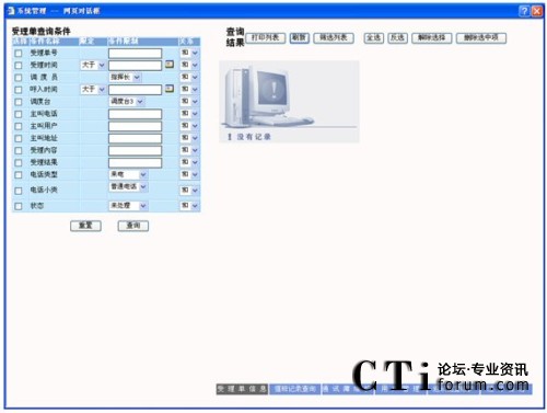 查詢:在要查詢的字段上打勾,輸入要查詢字段的信息及各條件間關系,點擊“查詢”按鈕,則在屏幕右側顯示相應的查詢結果,可以對這些查詢結果進行維護,查詢條件可自由定制。